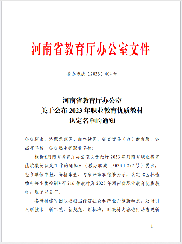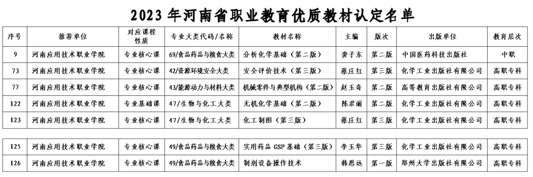 近日,河南省教育厅发布《河南省教育厅办公室关于公布2023年职业教育优质教材认定名单的通知》(教办职成〔2023〕404号)文件,我校《分析化学基础(第二版)》等7部教材入选2023年河南省职业教育优质教材名单,其中中职类教材1部,高职高专类教材6部。