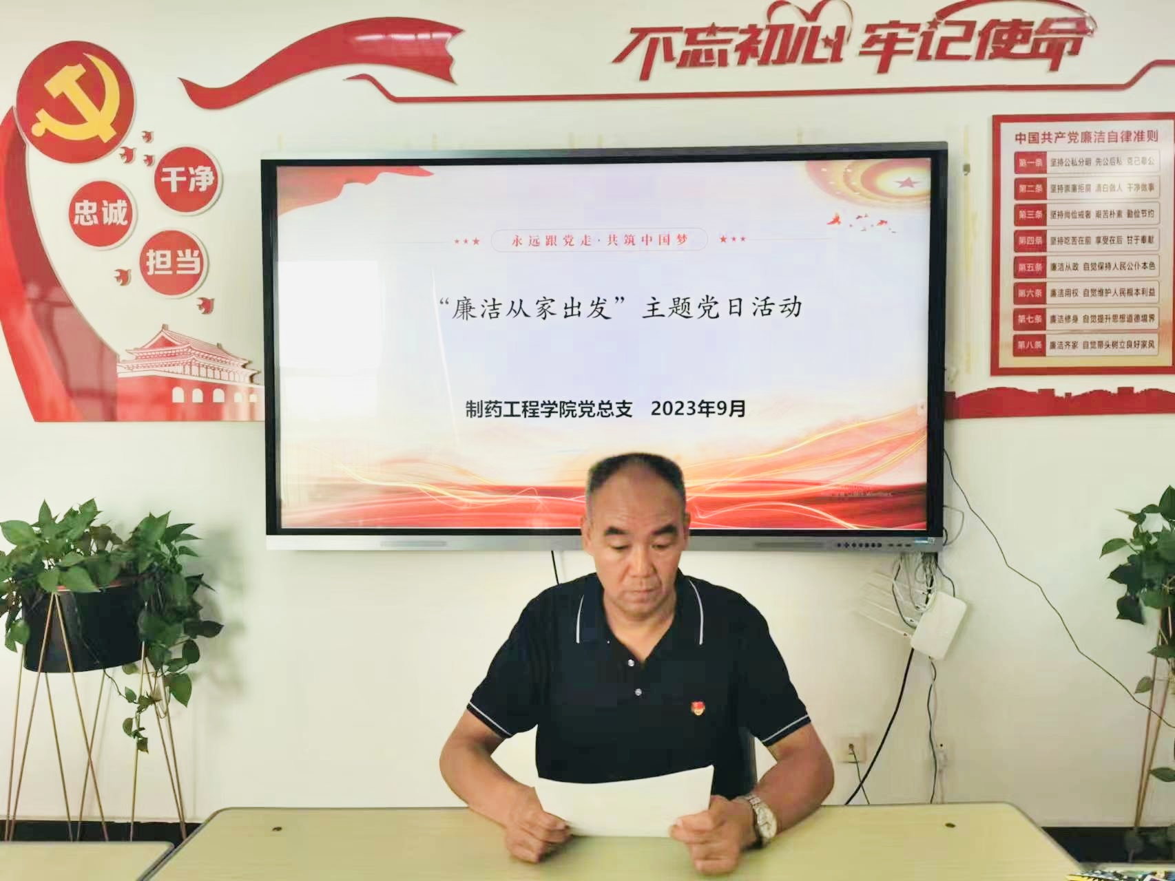 为深入为深入贯彻党的二十大精神,落实关于一体推进“三不"、 廉洁文化建设和家风建设精神,学习贯彻习近平总书记“注重家庭、注重家教、注重家风”重要讲话精神,引导、强化党员干部纪律、责任意识,切实筑牢拒腐防变思想道德防线。9月19日,制药工程学院党总支在501党员活动室开展“廉洁从家出发”主题党日活动。活动由党总支书记窦传斌主持,全体党员参加了活动。