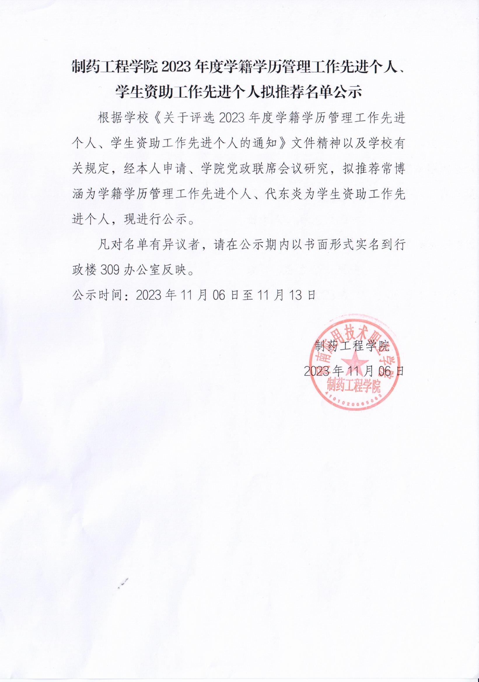 制药工程学院2023年度学籍学历管理工作先进个人、学生资助工作先进个人拟推荐名单公示