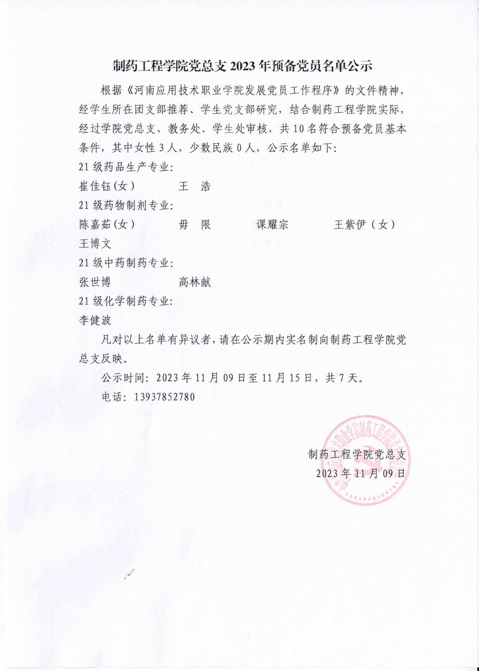 制药工程学院党总支2023年预备党员名单公示