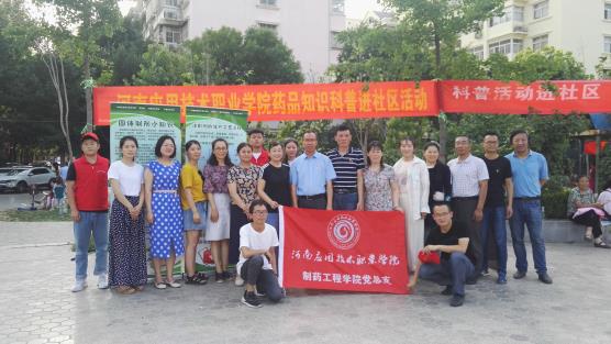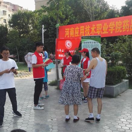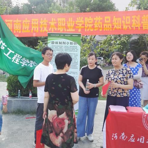 2019年6月14日下午,河南应用技术职业学院制药工程学院联合开封市宋城办事处集英社区,在集英花园居民小区中心广场,开展了一场“药品知识科普宣传进社区”活动。本次科普宣传活动的目的,是为了向社区居民传播科学知识、科学思想,帮助社区居民了解药品的生产过程,普及药品知识,树立合理用药观念,增强卫生健康意识和自我保健能力。制药工程学院学院领导、专业课教师、部分党员与青年志愿者共20人参加了这次活动,集英社区的工作人员配合提供了场地与设施。