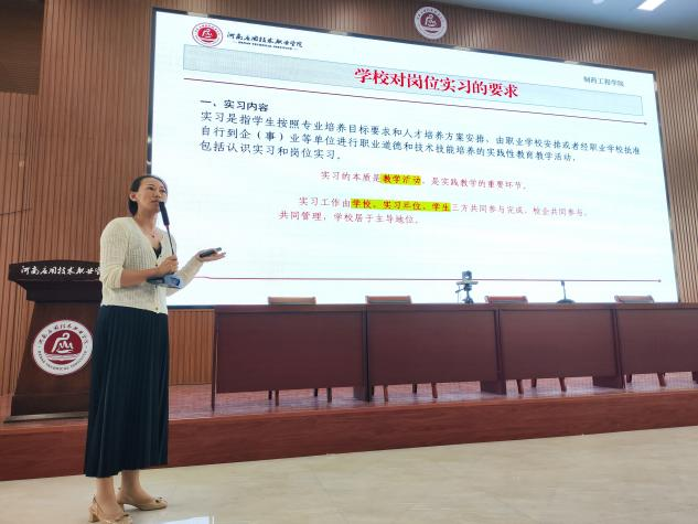 5月7日,制药工程学院2024年学生岗位实习动员大会在学生活动中心召开,二级学院院长吕玮,副院长高莉丽,顶岗实习指导教师和2022级学生代表出席动员会,大会由高莉丽主持。