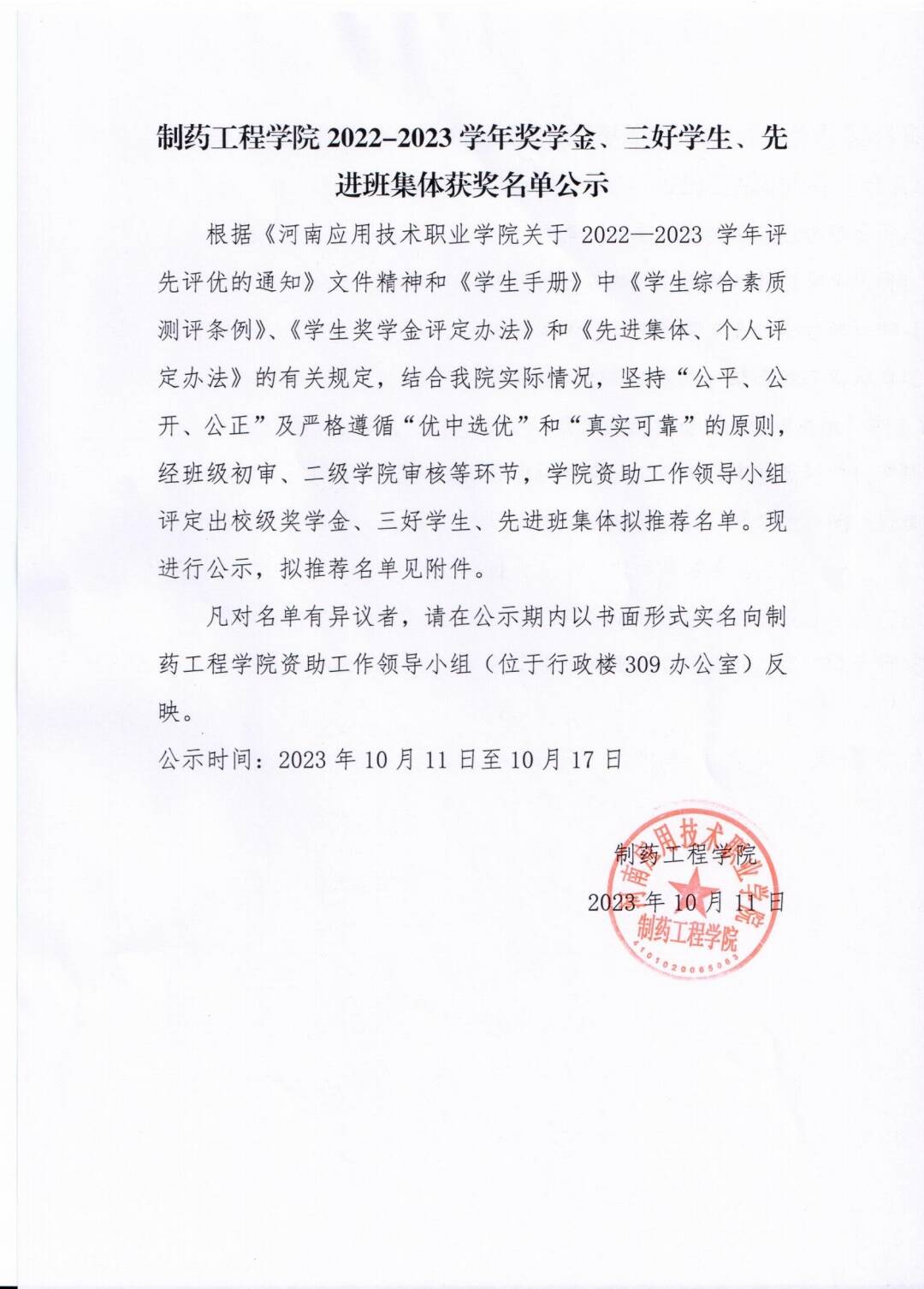 制药工程学院2022——2023年奖学金、三好学生、先进班集体获奖名单公示