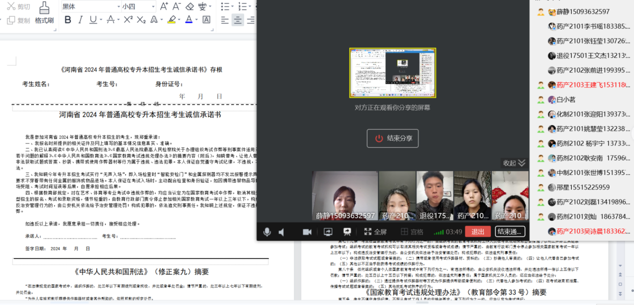 2024年专升本考试临近,为做好专升本考生考前相关工作,进一步端正考风、严肃考纪,引导考生树立诚信考试的正确价值观,制药工程学院于2024年3月12-3月16日之间召开线上专升本考试诚信教育主题班会,会议由制药工程学院专升本负责人薛静主持,各班专升本考生积极参会。
