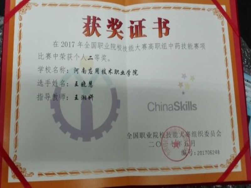 2017年6月2-4日,来自全国的120名选手参加了在连云港市举行的全国职业院校技能大赛高职组中药技能赛项竞赛。我院参赛选手王晓慧同学荣获高职组二等奖。