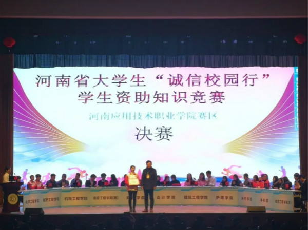 为响应诚信校园行的号召,宣传学生资助政策,普及金融基础知识,培养大学生的诚信意识和观念,2018年12月18日下午,河南应用技术职业学院在大礼堂举办了“诚信校园行”学生资助知识大赛。