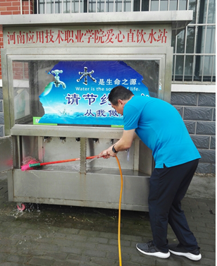 2018年5月15日上午,制药工程学院实训室管理员袁斌主动将直饮水平台清理得干干净净,受到前来取水的师生称赞。
